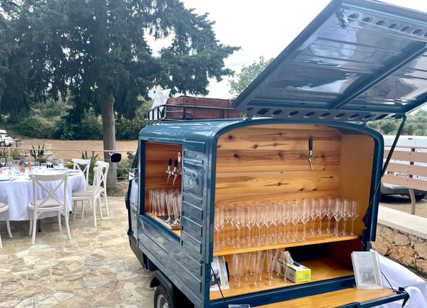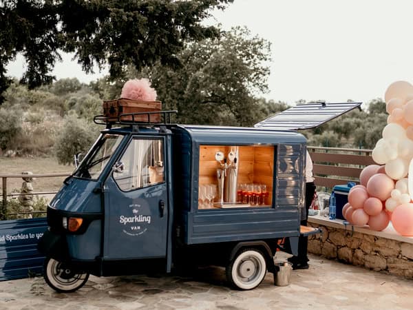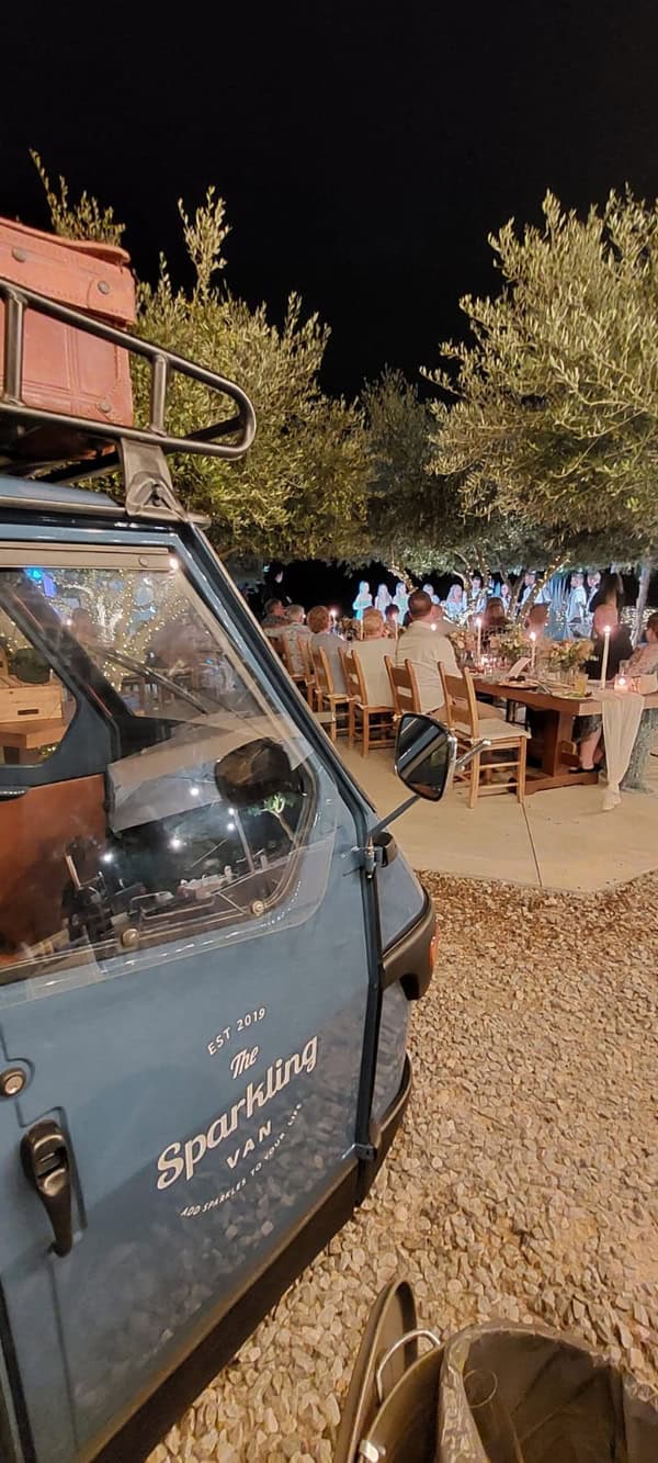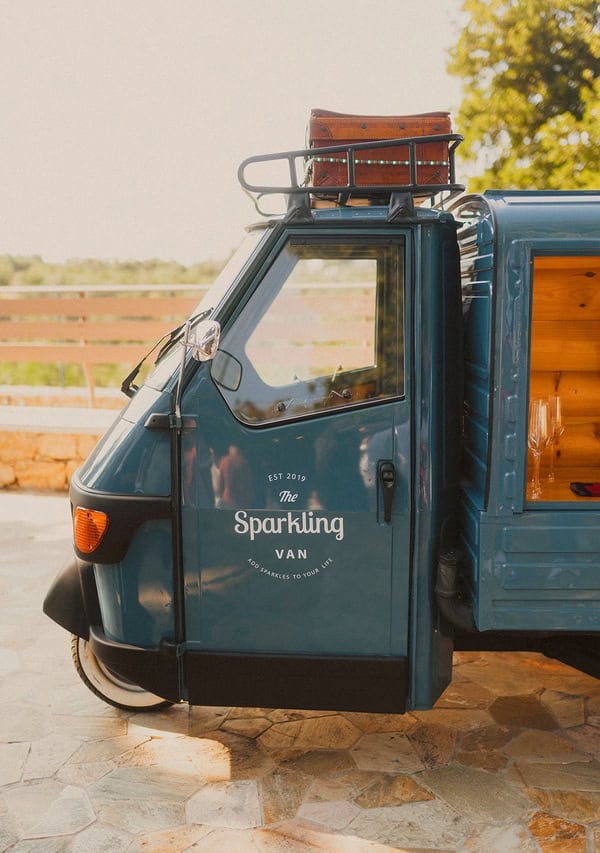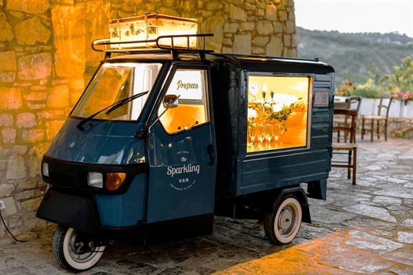 The Sparkling Van is a three-wheeled Piaggio Ape mobile vehicle with charming vintage character, straight from Italy. It traveled all the way from Pisa to the magical city of Chania and is now available to you, offering its services as a stylish mobile bar wherever you choose. Your guests will be able to enjoy their drinks from our unique mobile bar—anywhere in the city and at any event you’d like us to be part of—because the Sparkling Van becomes a highlight of your celebration and experience. It’s truly something for those who appreciate style and personality.