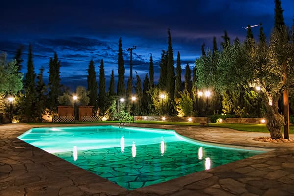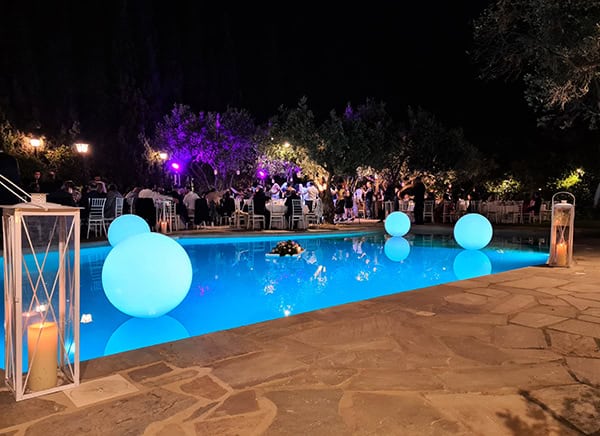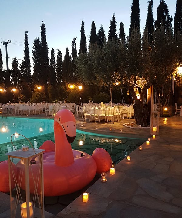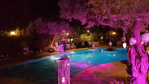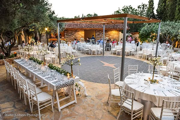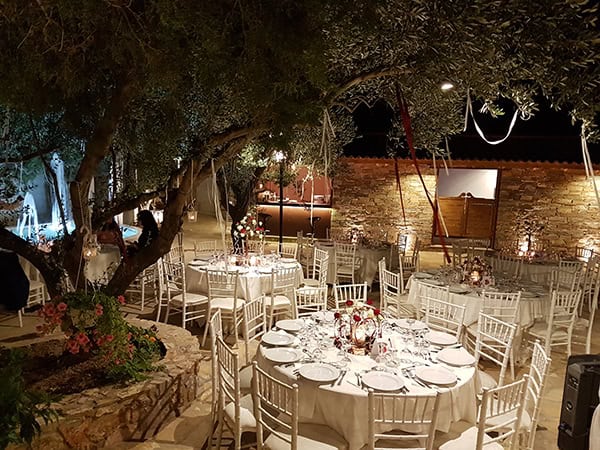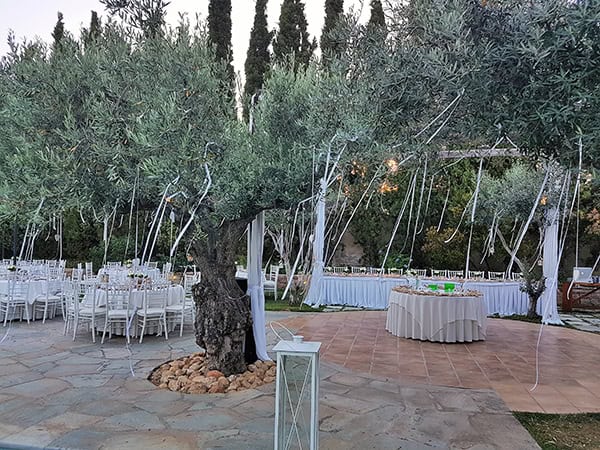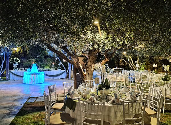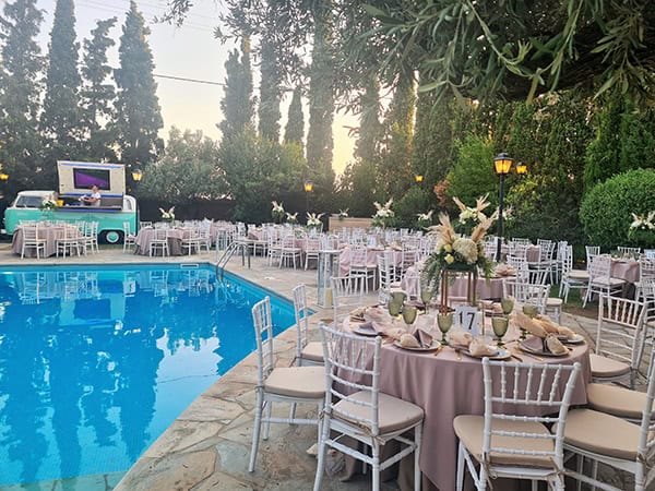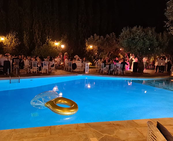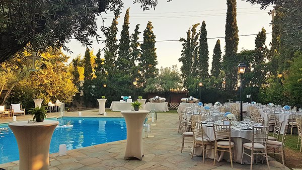 Poolside Velli: Accommodates 400 seated guests and 1,000 cocktail-style guests. It offers a romantic dinner in the olive grove under candlelight with a view of the pool, creating a setting that unveils Mediterranean beauty.